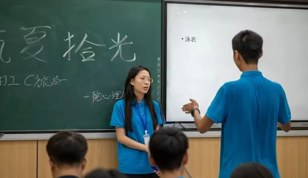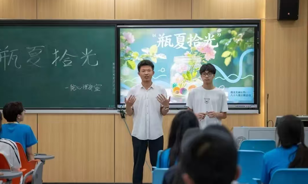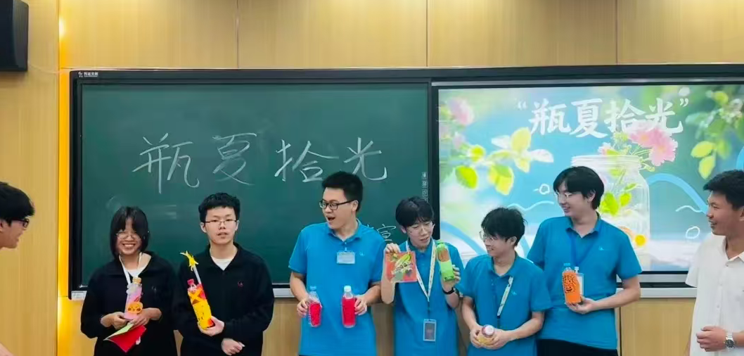 活动从清凉畅聊开始!主持人一句“夏夜垫着席子看星星”,瞬间勾起大家对长沙酷暑的共鸣。六月暴雨的清凉、八月骄阳的火辣……七嘴八舌的分享,让笑声和夏日记忆在教室里碰撞、升温。分组后,同学们执起漂流瓶,将夏日印象化为缤纷视觉。丙烯绘出的雨云带着凉意,彩纸拼贴的晨光唤醒希望。颜料在瓶身晕染,仿佛夏日的色彩正浸润心田。分享环节亮点纷呈!有的小组将各自的小瓶串联:绘有瓶盖灯塔的象征启航,瓶底小鱼群代表探索,瓶身浪花暗喻挑战,共同讲述一段夏日冒险地图。另一个小组则合力雕琢一个大瓶:瓶身泼洒出金红渐变晚霞,瓶腰缠绕绿意藤蔓,瓶口悬垂纸折小彩虹。不同笔触在曲面和谐共鸣,奏响一阕饱满的夏日颂歌。团队碰撞的火花,让每个瓶子都盛满了独特的故事。